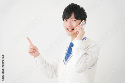 スマートフォンで電話をしながら左側を指差す男子高校生 白背景