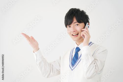 スマートフォンで電話をしながら手のひらで左側を指す男子高校生 白背景