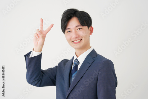 ピースサインをするビジネスマン 白背景