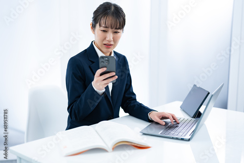 オフィス内で携帯を持つ忙しいビジネスウーマン