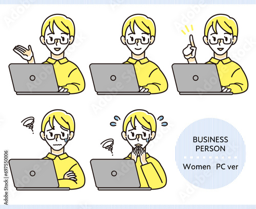 【単色】働く女性 パソコン イラストセット 販促 指差し 笑顔 困る 故障 【ビジネスパーソン】