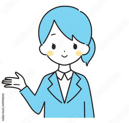 水色|案内するスーツの女性|右手