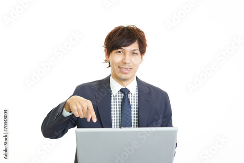 personal computer, man, man, smile, people, success, businessman, business, health, happy, happiness, japanese, glory, hope, raise, achievement, victory, promotion, face, hair, courage, tenacity, cosmetic, model, healthful, good-looking, office, light, clean, white background, copy space, pose, work, uniform, adult, expression, japan, corporate, employee, adult, work