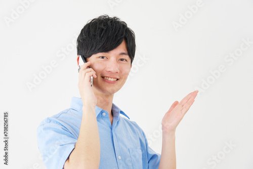 スマートフォンで通話しながら右側を手のひらで指す男性 白背景