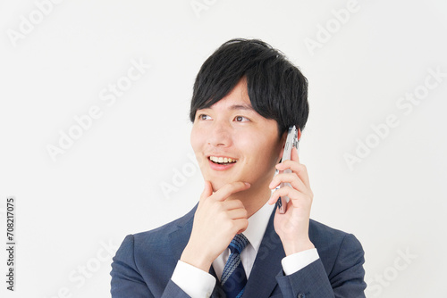 想像しながらスマートフォンで通話するビジネスマン 白背景
