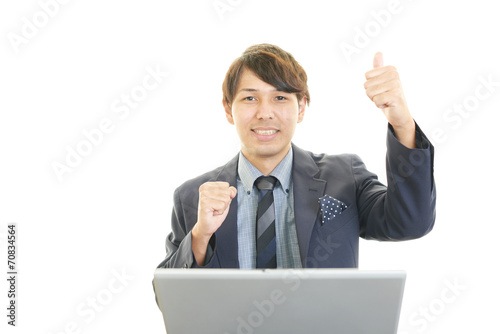 personal computer, man, man, smile, people, success, businessman, business, health, happy, happiness, japanese, glory, hope, raise, achievement, victory, promotion, face, hair, courage, tenacity, cosmetic, model, healthful, good-looking, office, light, clean, white background, copy space, pose, work, uniform, adult, expression, japan, corporate, employee, adult, work
