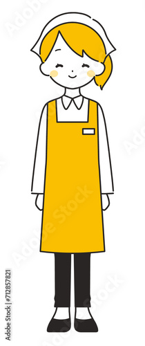 オレンジ色|笑顔の三角巾をした女性店員|エプロン