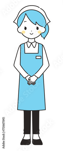 水色|笑顔で手を組む三角巾の女性店員|エプロン