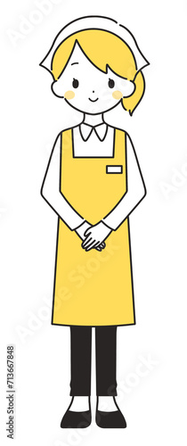 黄色|笑顔で手を組む三角巾の女性店員|エプロン