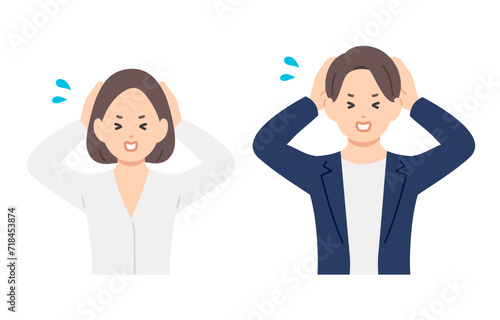 頭を抱えて困るポーズをするビジネスパーソン男女のセット【人物ベクターイラスト素材】