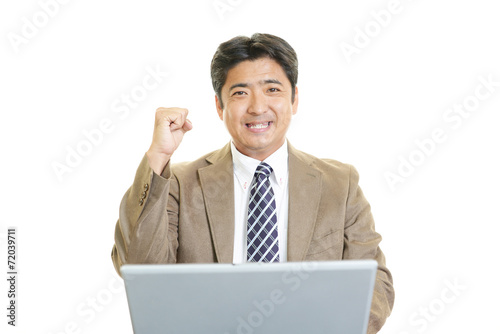 personal computer, man, man, smile, people, success, businessman, business, health, happy, happiness, japanese, glory, hope, raise, achievement, victory, promotion, face, hair, courage, tenacity, cosmetic, model, healthful, good-looking, office, light, clean, white background, copy space, pose, work, uniform, adult, expression, japan, corporate, employee, adult, work