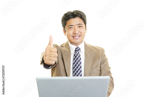 personal computer, man, man, smile, people, success, businessman, business, health, happy, happiness, japanese, glory, hope, raise, achievement, victory, promotion, face, hair, courage, tenacity, cosmetic, model, healthful, good-looking, office, light, clean, white background, copy space, pose, work, uniform, adult, expression, japan, corporate, employee, adult, work
