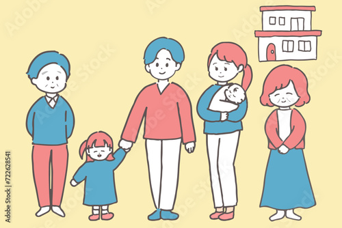 三世代家族の全身イラスト ピンクとブルーの配色 背景色あり