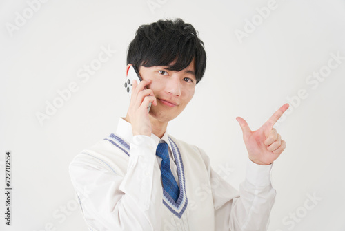 スマートフォンで電話しながらチャックサインをする男子高校生 白背景