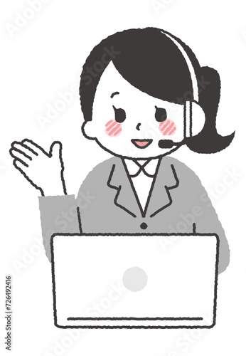 パソコンでオペレーターをしている人物イラスト。コールセンターで電話対応している女性