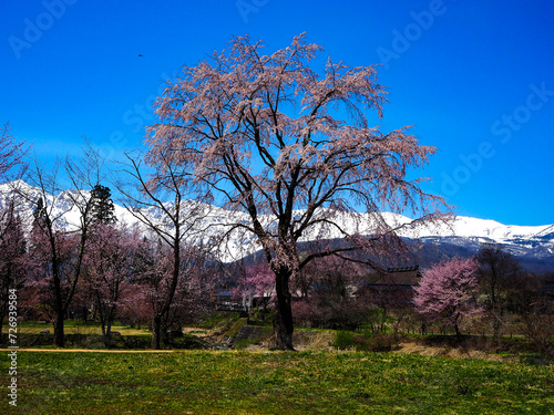 桜と残雪の北アルプス