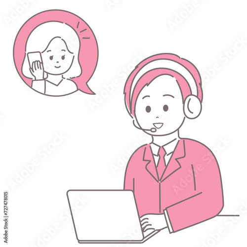 オペレーターの男性がパソコンを見ながら女性とインカムで会話をしているイラスト
