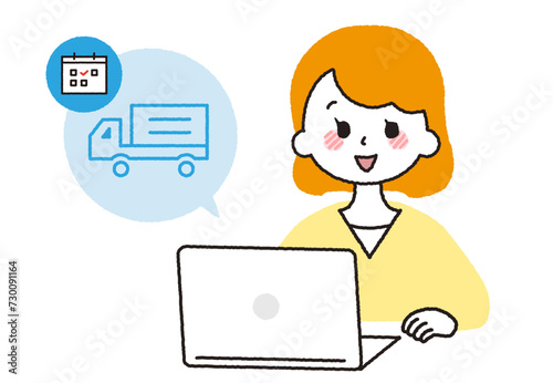 パソコンでオンラインショッピングをする女性。配送方法と日時指定をするシーン。