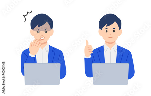 パソコンを見てショック・グッドのポーズをするビジネスパーソン男性のセット【人物ベクターイラスト素材】