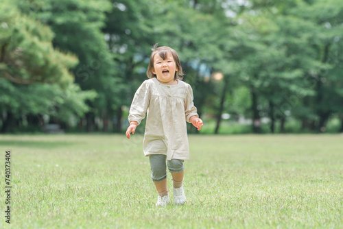 芝生の公園で遊ぶ女の子・子供・キッズ(はしゃぐ・笑顔・成長)