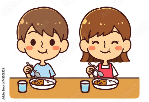 笑顔でカレーを食べる子供たち イラスト素材