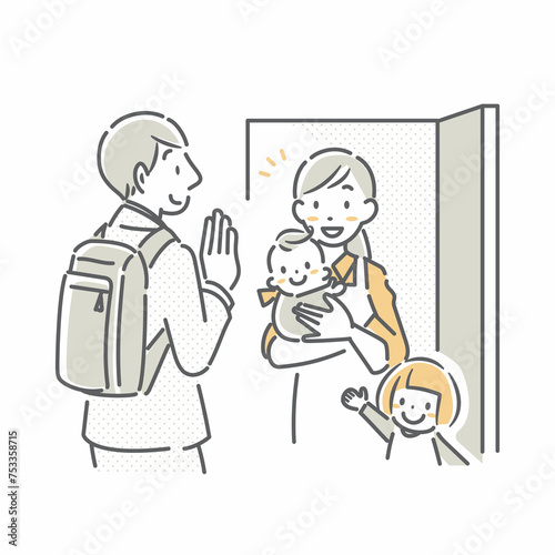 ベビーシッターに子供たちを預け出勤するお父さん シンプルでお洒落な線画イラスト