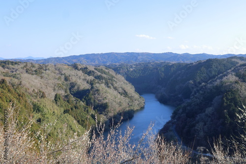 渓谷から眺める春の木々が茂る風景