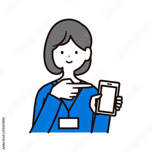 スマートフォンを持っている社員証を下げた日本人女性会社員のイラスト素材