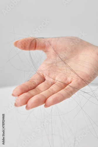 抜けた頭髪を持つ女性の手元
