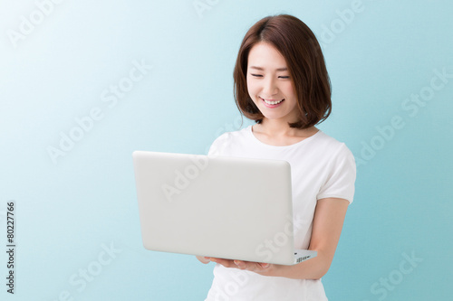 パソコンを見る笑顔の女性