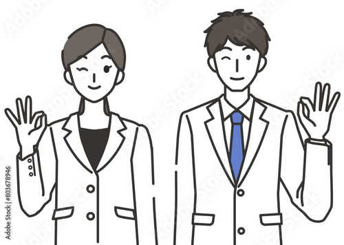 オッケーポーズの白衣を着た男性と女性のイラスト