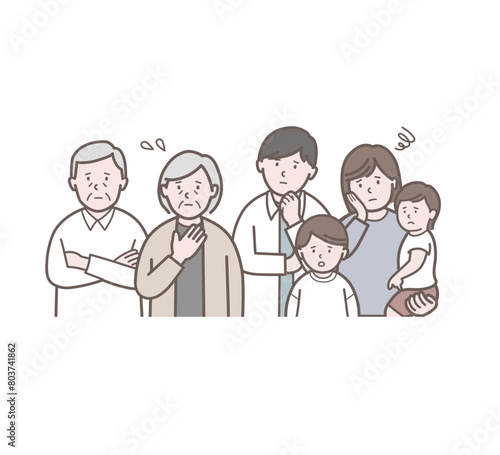 悩む、困った顔の小さい子供と犬のいる二世帯家族の上半身イラスト