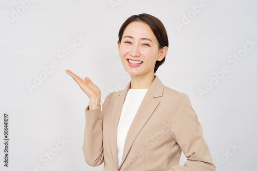 手の平で左を指すミドルエイジのビジネスウーマン 白背景