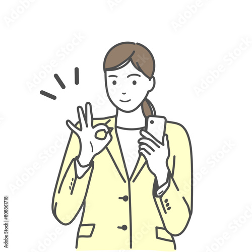 スマホを持ち指でオーケーサインを出す笑顔のスーツ姿の女性 白バック、白背景、背景なし、シンプル