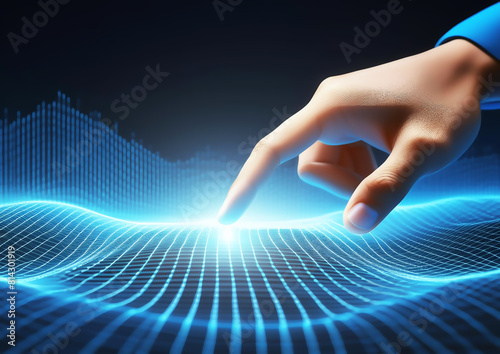 科学技術の概念でデジタルの青い光を指で操作する動作