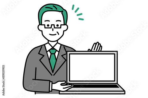 ノートパソコンの画面を見せる年配のスーツの男性