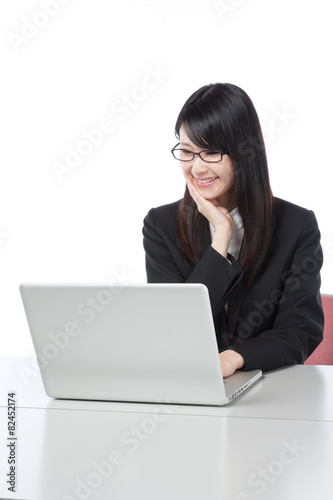 business, personal computer, woman, japanese, meeting, work, suit, asian, notebook, earnest, young, beauty, black hair, ponytail, long hair, shirt, sweet, ardent, clean, corporation, salaried employee, employee, pretty, office, smile, white background, finance, cyberspace, economic, sale, light, desk, table, seat