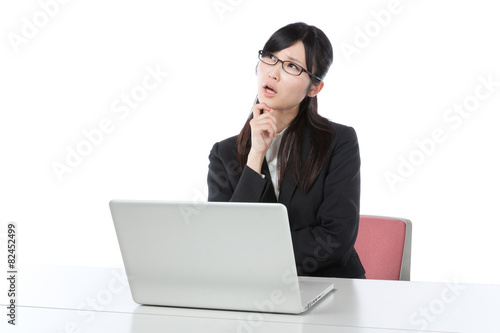 business, sweet, personal computer, woman, young, puzzle, light, pretty, japanese, beauty, table, seat, clean, office, meeting, work, long hair, impatience, white background, salaried employee, suit, black hair, cyberspace, asian, desk, notebook, contemplate, employee, corporation, thought, earnest, ponytail, problem, glasses, shirt