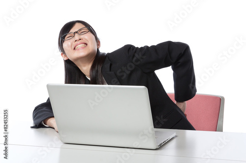 business, sweet, personal computer, back, woman, young, pretty, japanese, table, seat, clean, office, work, long hair, white background, salaried employee, suit, black hair, cyberspace, asian, desk, notebook, fatigue, hip, employee, corporation, ponytail, pain, glasses, attitude, shirt, overtime, backache, sluggish