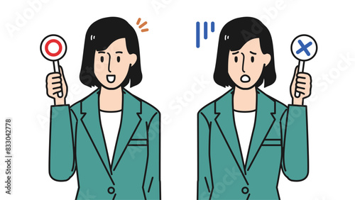 【案内/解説に最適】マルの正解札とバツの不正解札を持つスーツ姿の若い女性のイラスト