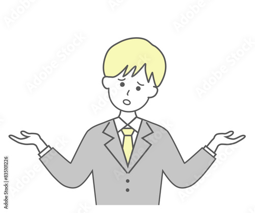 疑問を持ち悩むスーツ姿の男性ビジネスマンと吹き出しのイラスト素材
