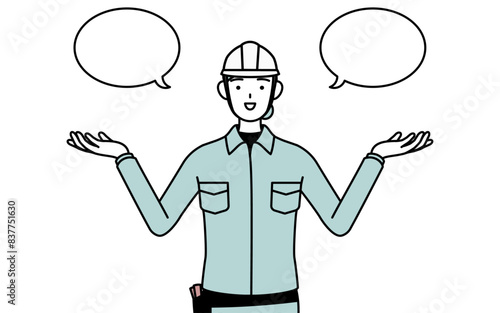 ふきだしつき、比較をするヘルメットと作業着姿の女性技師