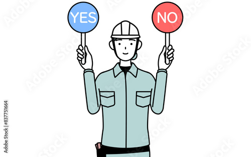 正解と不正解を示す棒を持つヘルメットと作業着姿の女性技師