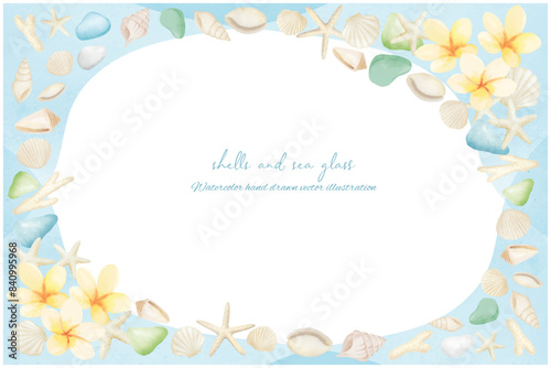 水彩で描いたカラフルなシーグラスと白い貝殻のフレーム