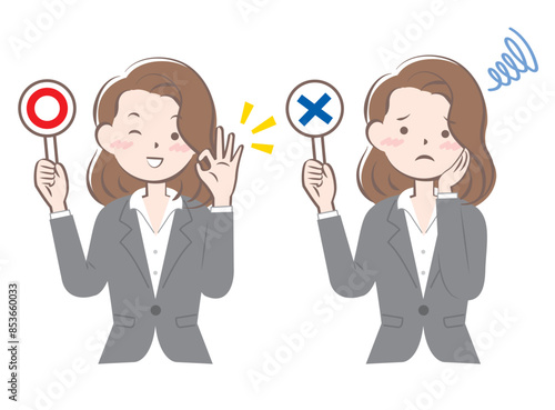 マルバツの札を持つスーツ姿の女性 正解 不正解