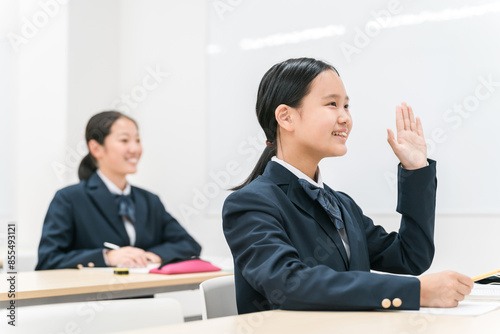 塾・学校の教室で先生に勉強を教わる小学生・中学生・高校生の子供(女の子)