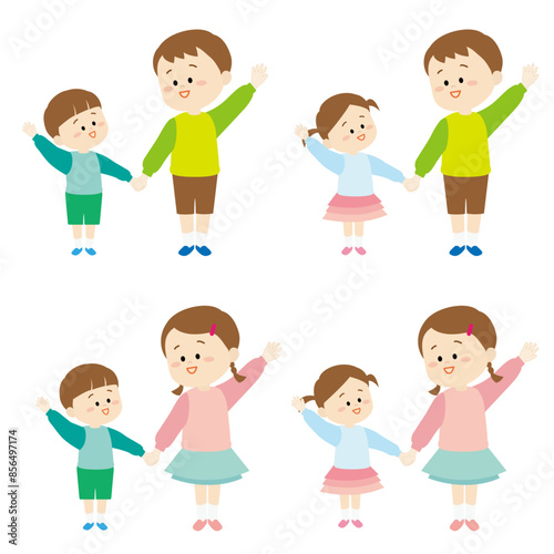 手を繋いで横断している兄弟のセットイラスト