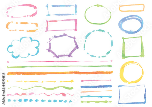 カラフルな水彩風の不揃いな太さの手描きの線やフレームのセット