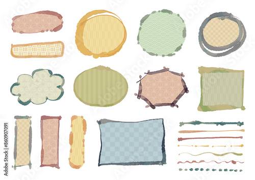落ち着いた色の和柄の不揃いな太さの手描きの線やフレームのセット