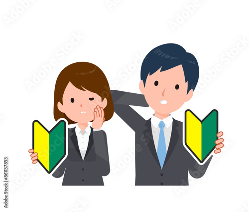 スーツを着たビジネスピープル男女。初心者マークを持って不安そうな表情。